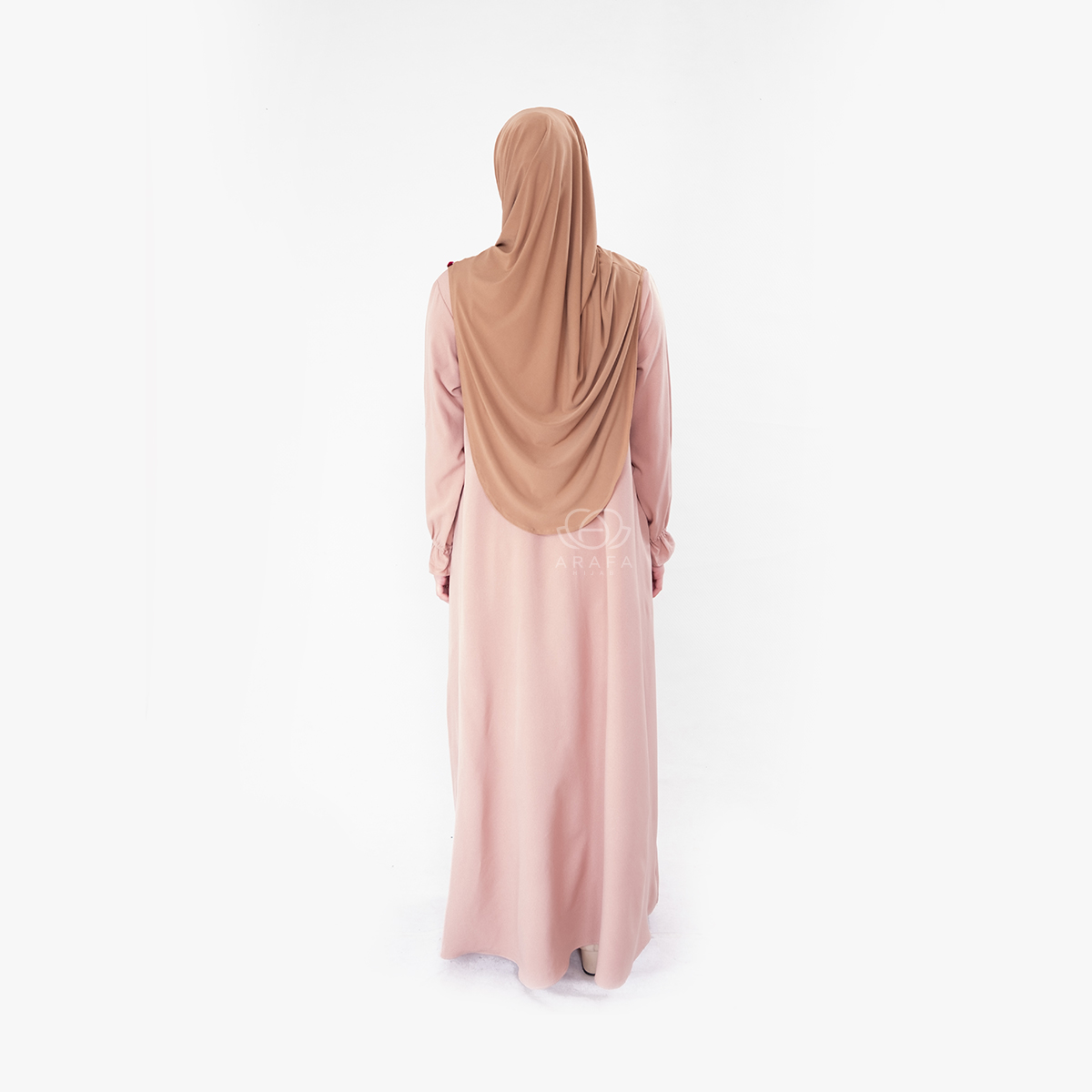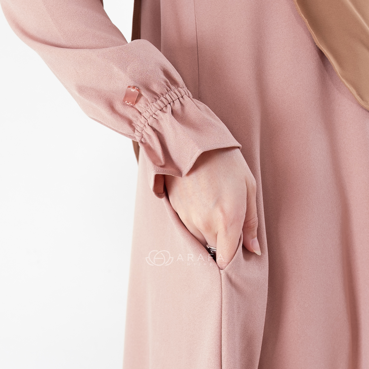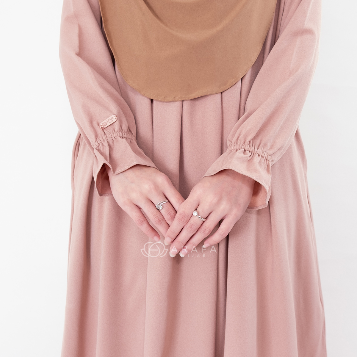 Details : Poet sleeve dengan karet (wudhu friendly), kerutan bagian tengah agar bagian bawah dress cukup lebar leluasa saat beraktifitas, saku kanan kiri, dan resleting bagian dada (busui friendly).